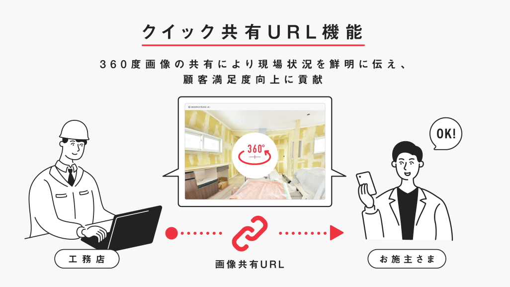 合わせて、新機能「クイック共有URL」機能も提供開始します。施主へ360度画像の共有が可能になり、現場の状況を鮮明に伝えることで顧客満足度向上に貢献します。