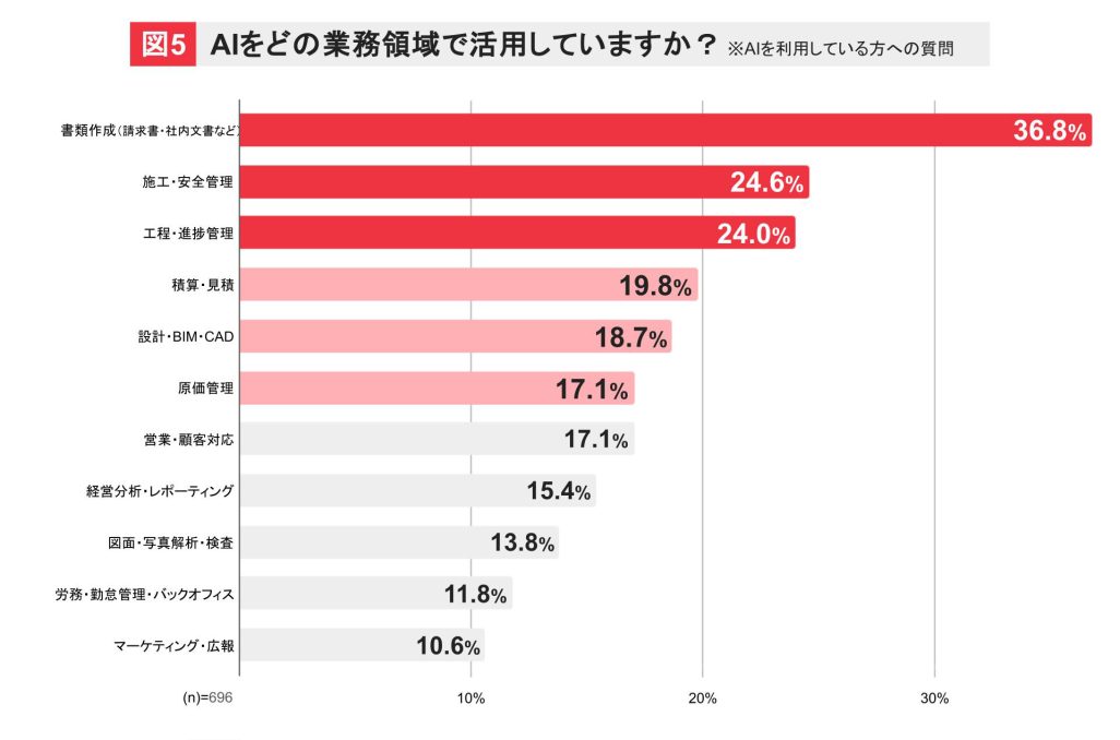 「書類作成」というイメージのしやすいAI活用が36.8%と一番多く、「施工・安全管理」24.6%や「工程・進捗管理」24%といった建設特有の領域での活用が進んでいます。また、積算や設計、原価管理の領域でも約2割となっており、現場からバックオフィスまで様々な領域でAI活用が始まっています。(図5)